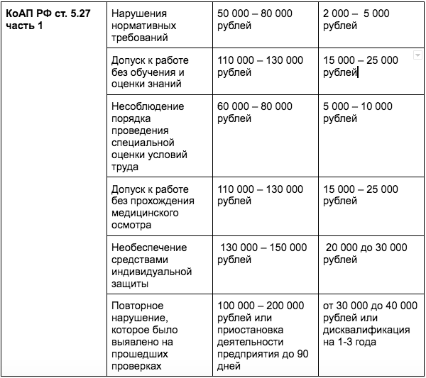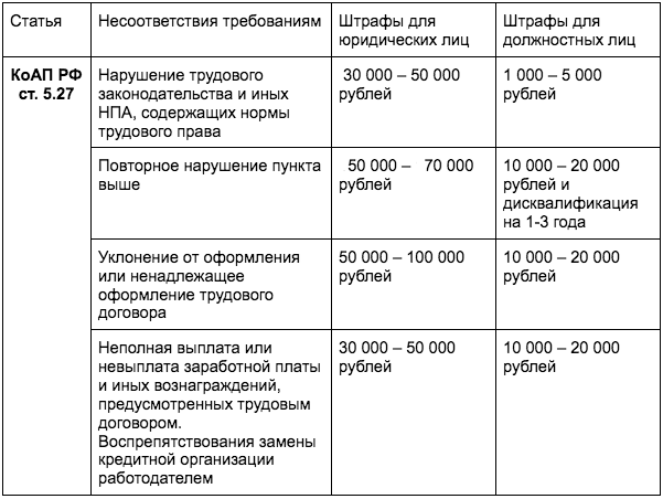 Юридическая ответственность указана в Кодексе РФ об административных правонарушениях. Согласно статье 5.27 на компанию могут быть наложены санкции. Для наглядности они приведены в таблице ниже.