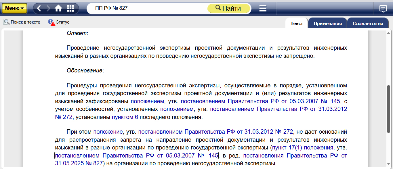 Постановление Правительства РФ от 31.05.2025 № 827 вносит изменения в порядок проведения государственной экспертизы. Ключевое нововведение: проведение государственной экспертизы изысканий и проектной документации в разных организациях теперь запрещено (п. 17(1) ПП РФ № 145).
