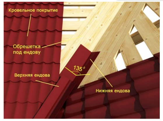 • Ширина основания ендовы. Согласно п. 6.4.1.2 СП 17.13330.2017, основание под разжелобок (ендову) должно быть сплошным деревянным настилом шириной 700 мм. (Смотреть обоснование.)