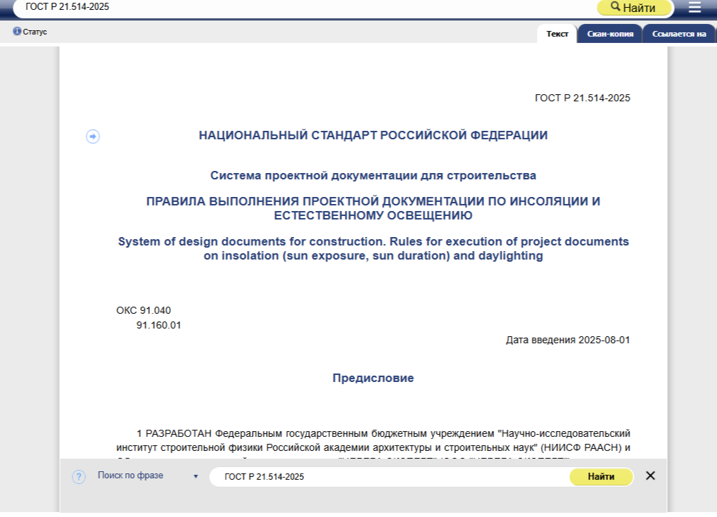 В области проектирования зданий и сооружений важным стал ГОСТ Р 21.514-2025 «Система проектной документации для строительства. Правила выполнения проектной документации по инсоляции и естественному освещению». Обновленный стандарт регламентирует требования к выполнению проектной документации в части инсоляции и естественного освещения, что необходимо для создания комфортной и энергоэффективной среды в зданиях. Стандарт ссылается на следующие ГОСТы и СП: