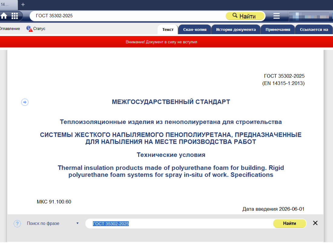 ГОСТ 35302-2025 (EN 14315-1:2013) «Теплоизоляционные изделия из пенополиуретана для строительства»