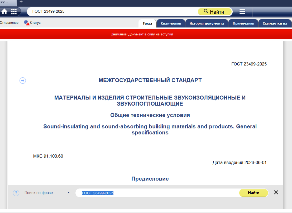 ГОСТ 23499-2025 «Материалы и изделия строительные звукоизоляционные и звукопоглощающие. Общие технические условия» – действует с 1 июня 2026 года