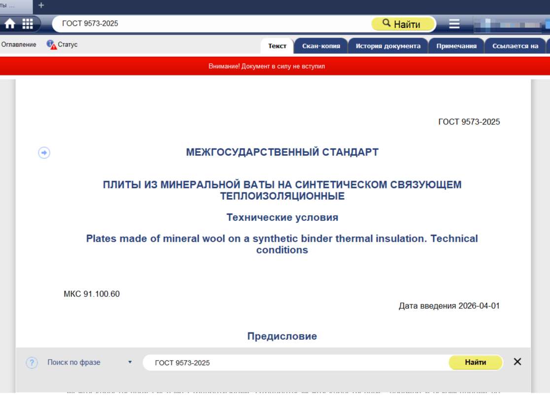 ГОСТ 9573-2025 «Плиты из минеральной ваты на синтетическом связующем теплоизоляционные. Технические условия» – действует с 1 апреля 2026 года