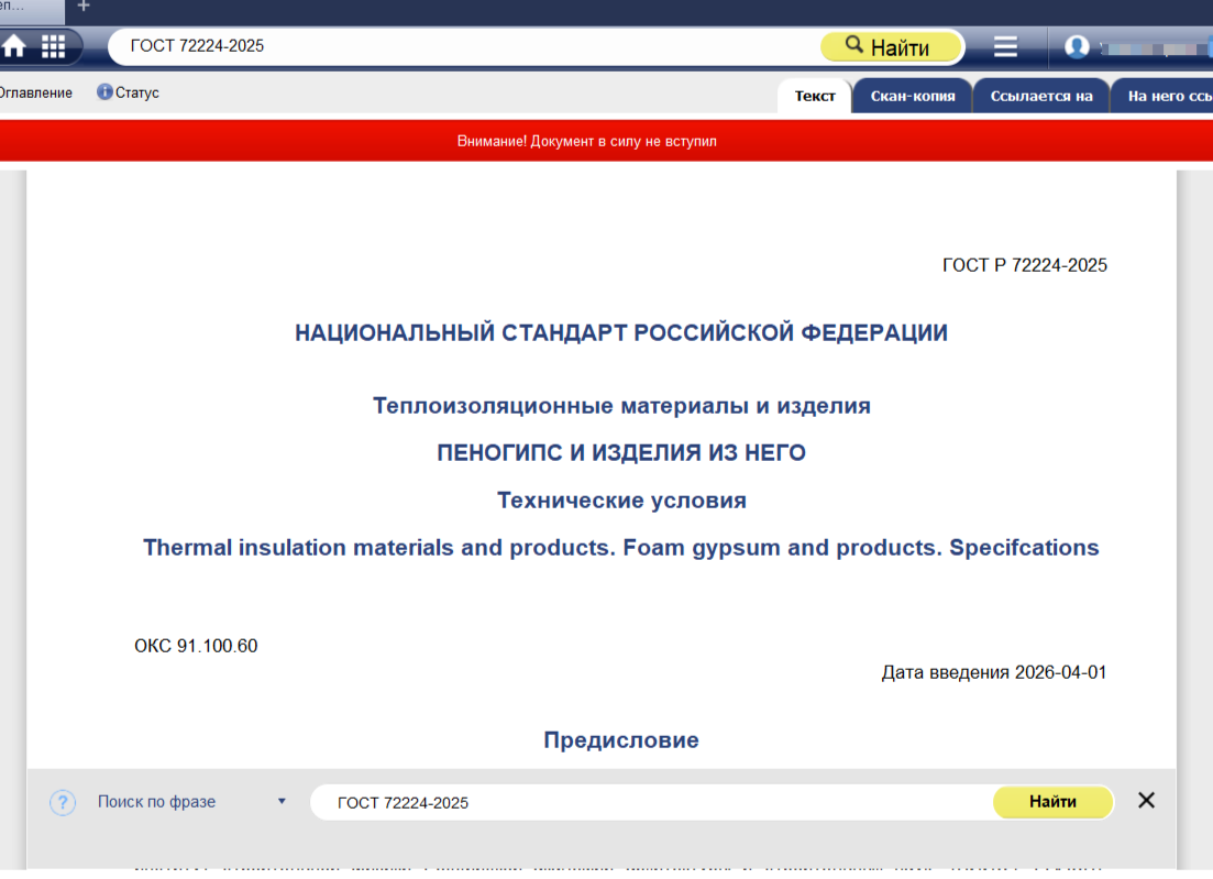 ГОСТ Р 72224-2025 «Теплоизоляционные материалы и изделия. Пеногипс и изделия из него. Технические условия» – действует с 1 апреля 2026 года
